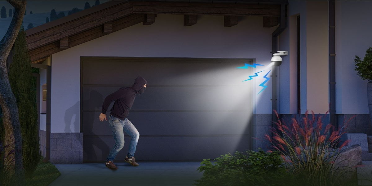The camera features the active defense function to provide an extra layer of protection. Upon detection of intruders, the camera will set off a loud siren and flash two spotlights² for on-site deterrence.