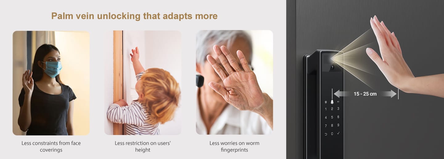 With the Y3000FVP Plus, everyone can unlock with confidence with plenty of options. In addition to 3D faces, users create unique, safe access with their hands, without pressing hard on a fingerprint sensor.
